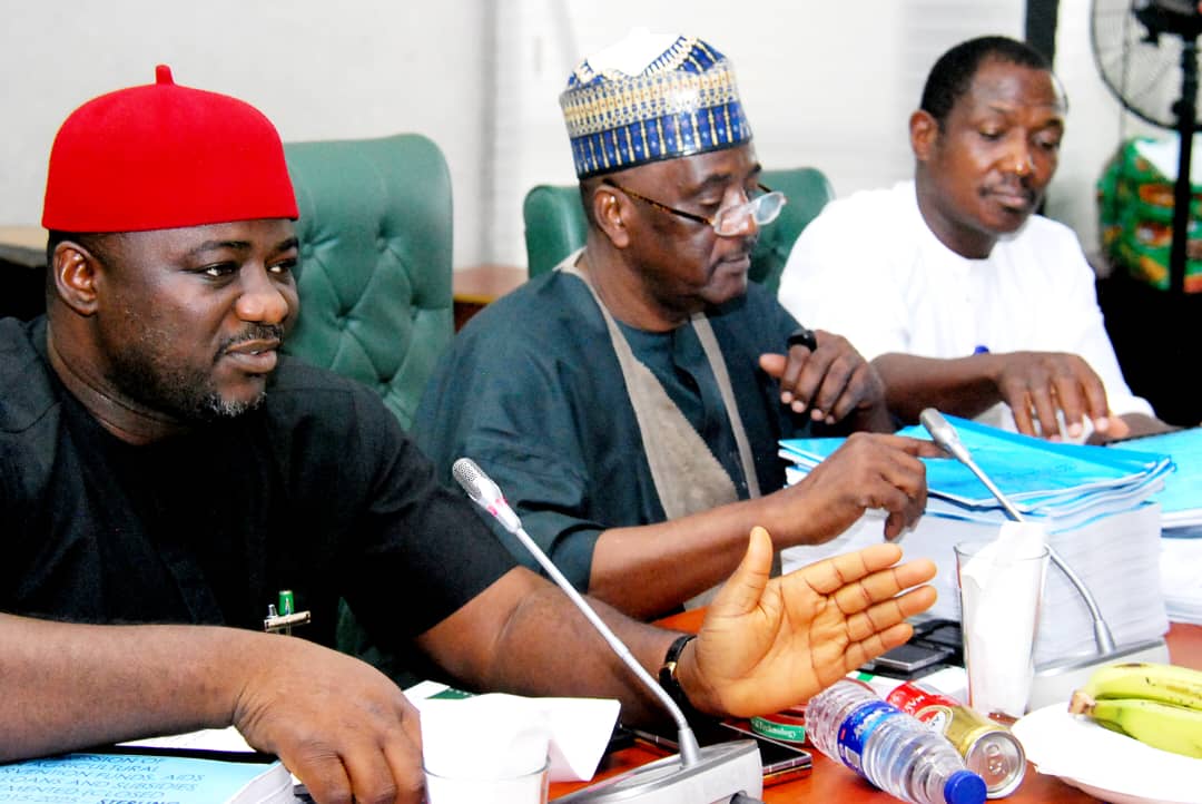 Rom left Ad-hoc Deputy Chairman of the Committee, Hon, Sunday Umeha , Ad-hoc Committee, Chairman , Hon,Jamo Aminu and Clerk of the Committee, Mr Ukachukwu Chidiebere, During the Meeting of the Members Ad-hoc Committee on Agricultural Subsidy Intervention Funds, Aids and Grants programmed, held at the National Assembly Complex, in Abuja Tuesday PHOTO JONATHAN LOIS