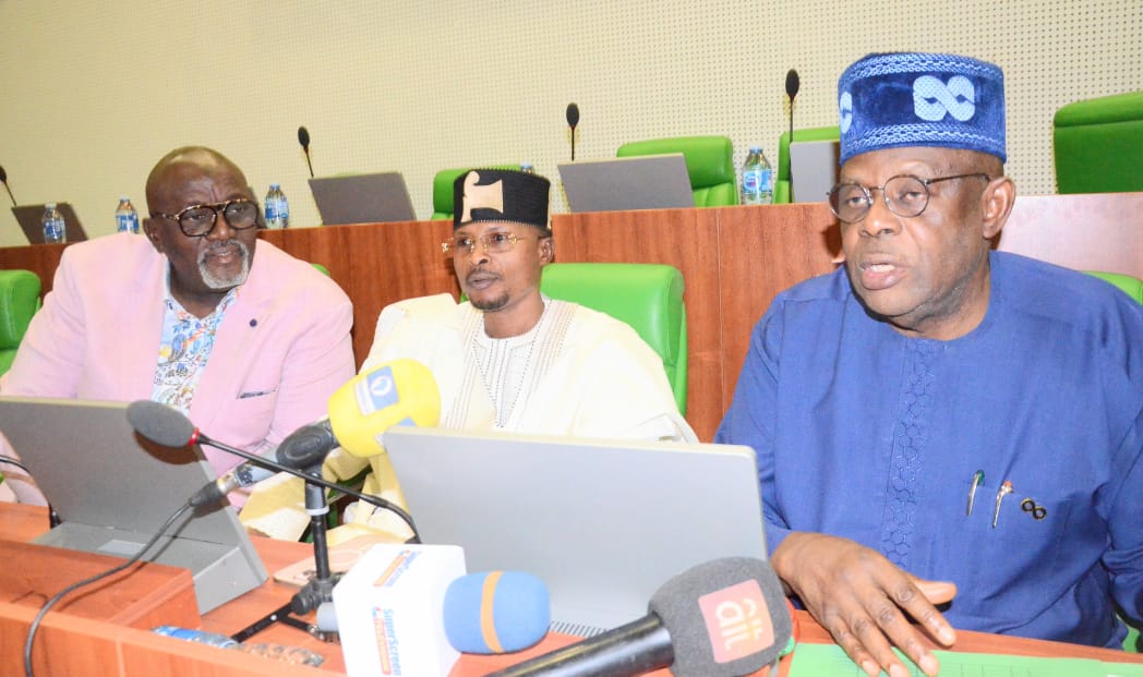 L-R: Member of the committee on Finance, Hon. Olajide Stanley Adedeji, Hon. Leke Abejide and chairman of the committee, Hon. Feleka James Abiodun, during an investigative hearing by the committee on its Revenue Monitoring Exercise, covering the 2023–2025 fiscal years, at the National Assembly in Abuja on Tuesday. PHOTO: JONATHAN LOIS