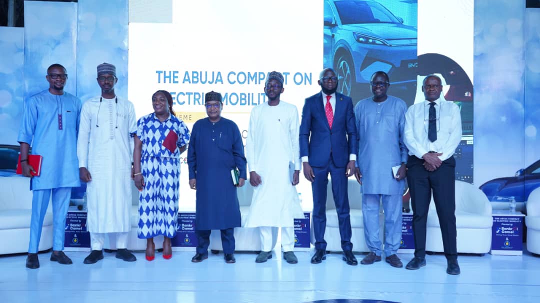 From left, Deputy Manager, Energy Access, Clean Technology Hub; Kolade Kolawole; Principal Industrial Officer, National Automotive Design and Development Council, NADDC; Engr. Ibrahim Yazid, Head, Stakeholder Management, Pi-CNG & EV; Omolara Obileye, CEO, Greenado; Dr. Lawal Gada, CEO, Bankrol CamelEV and Blue Camel Energy; Yusuf Suleiman, Divisional Head, Commercial & Institutional Banking (Core North), The Alternative Bank; Muhammed Abdul, President, Electric Mobility Promoters Association of Nigeria, EMPAN; Engr. Dapo Adesina, and Director, Vehicle Electrification, National Automotive Design and Development Council, NADDC,Engr. Abdullahi M. Ayinde, during the Abuja Compact on Electric Mobility Roundtable, held at Bankrol Camel EV, in Abuja PHOTO JONATHAN LOIS