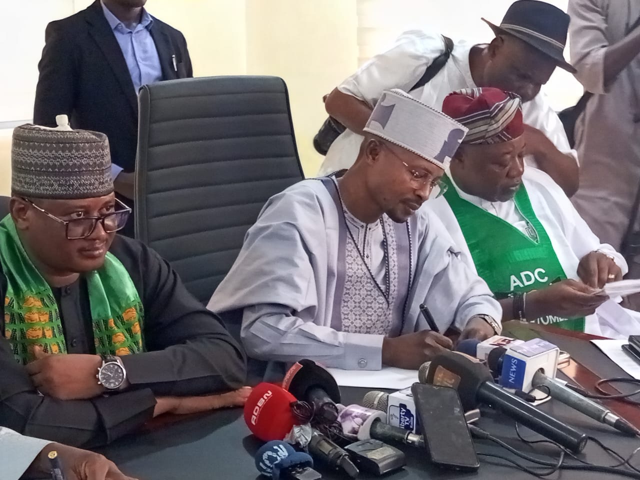 L-R: National chairman of African Democratic Congress (ADC) Hon. Nafiu Bala, member of the party, Hon Leke Abejide and Chief Omotosho Oluseyi, during the World Press Conference to addressed party inter issues by the National Chairman of the African Democratic Congress (ADC) and ADC National Leader on Friday in Abuja PHOTO: Jonathan Lois